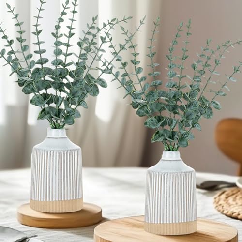 Eucalyptus in Cute Boho Vase: The ceramic vase’s elegant vertical ridges and glossy glaze perfectly complement the realistic-looking white-powder-treated eucalyptus stems for a truly eye-catching display. The neutral white and tan colors of the farmhouse vase for seamlessly blend in with any decor, making it the perfect accent piece for any space